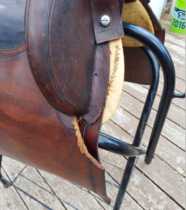 DAMAGE to the leather on the FRONT and RIGHT SIDE of this saddle. Also, one piece of hardware on the front left side has been pulled out at the bottom. The Pellonara has some areas of wear and a few small tears. The Carona has some staining on one side. The tree is solid as is all the hardware. Most of the leather is good (stitching all good) except for areas mentioned.