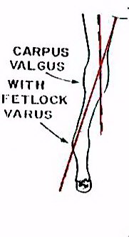 Angular limb deformities in the foal are defined as a deviation from normal alignment when viewed from the front. The deviation from normal may be in any of the joints or long bones of the legs. The deviation is seen as a lateral (outward or valgus) or medial (inward or varus) bowing of the limb usually at a joint. Deformity may involve the front and rear legs.